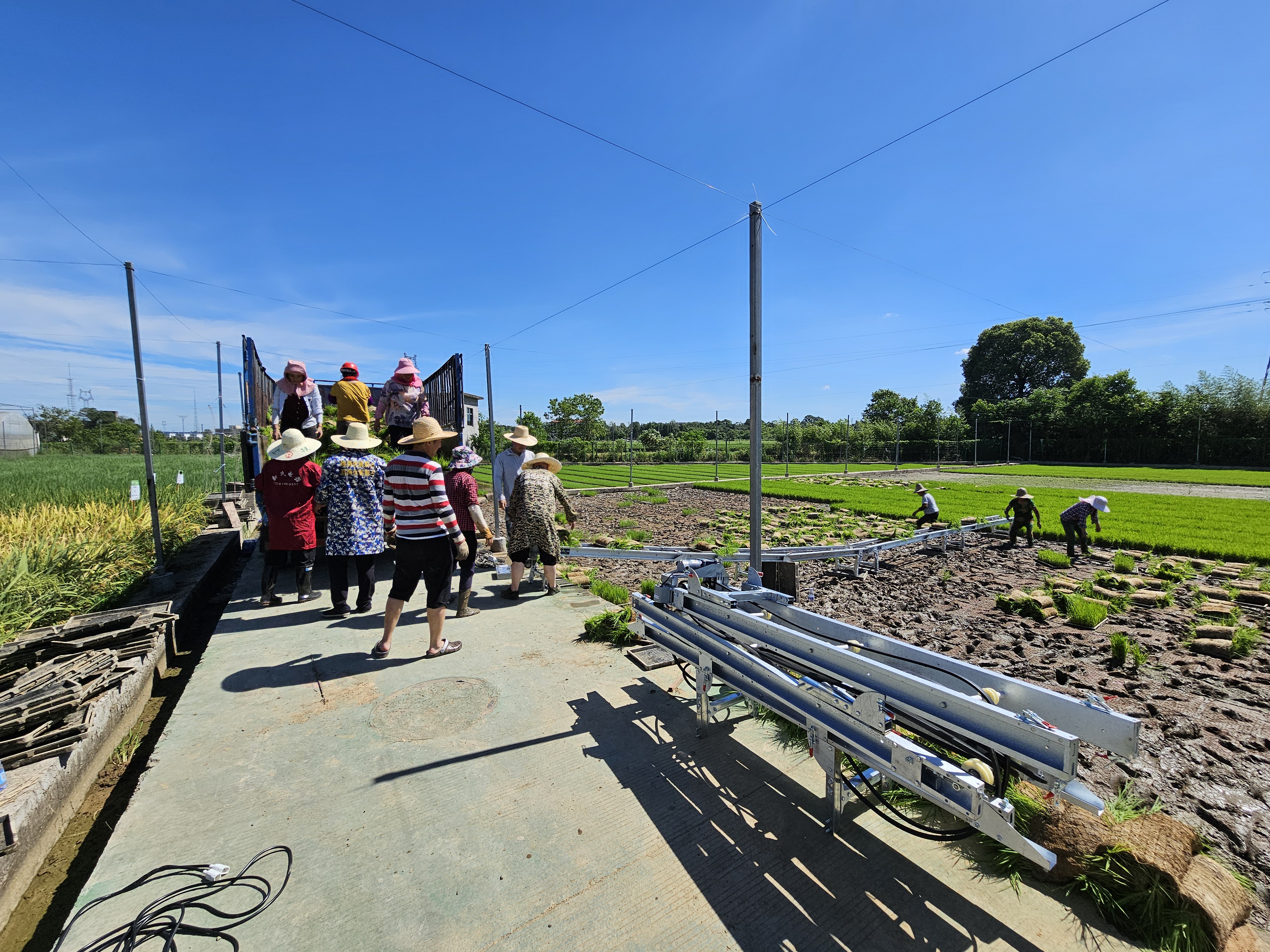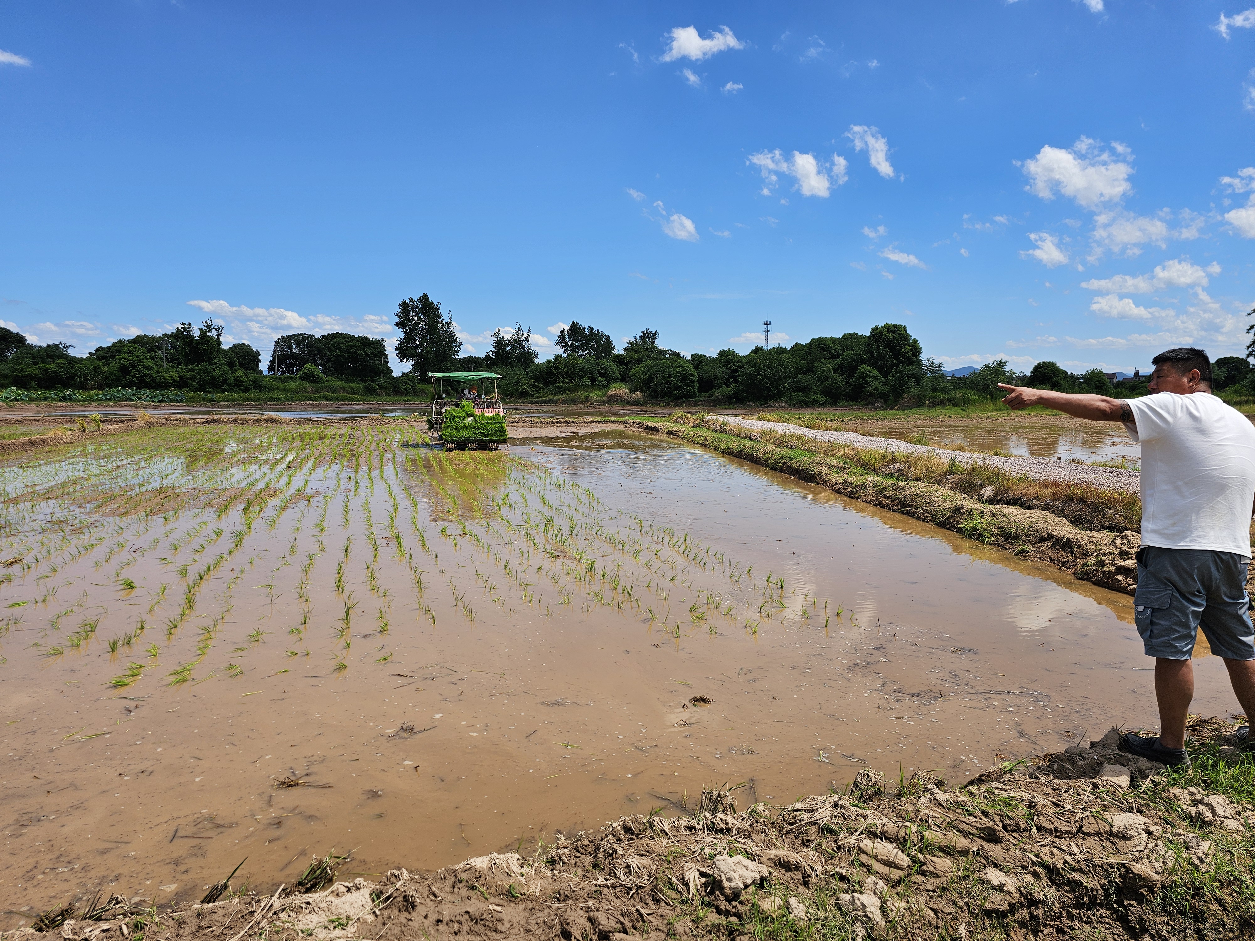 在作業(yè)現(xiàn)場可以看到,運苗、碼放秧盤、機插秧等一序列工作有序進行,農(nóng)機手們熟練的駕駛插秧機在田里穿梭,全程機械化,十幾分鐘就能完成一畝地的插秧作業(yè),一會功夫稻田里便綠意盎然,平均一天一臺插秧機能完成50畝的插秧,在酷暑中極大降低了戶外人工作業(yè)的風險。